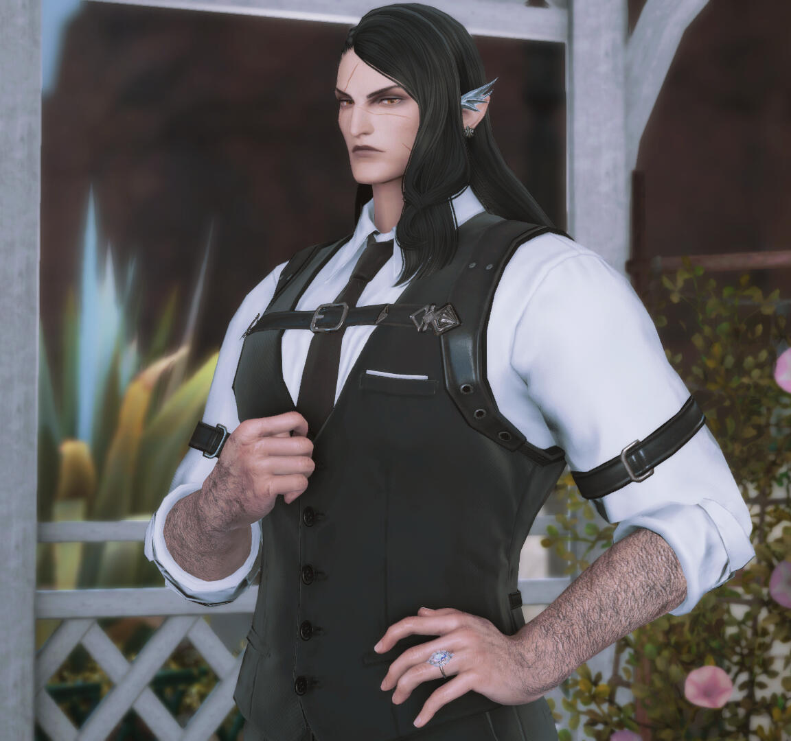 MORAL ALIGNMENT: Lawful NeutralOCCUPATIONS: Personal security for Kisz'a Vekharu, Captain of the guard for the Sleeping Sands, disciple of Halone, Ishgardian Temple Knight (former), dragoon candidate (failed).VIRTUES: Chaste, Dutiful, Faithful, Reliable, LoyalVICES: Brutal, Unrelenting, Obstinate, Susceptible to Temptation, WrathfulDEMEANOR: Stoic. Modest. Calculating. Disciplined. Observant. Curt.FIRST IMPRESSIONS: Wick is a tall, imposing Elezen of impressive stature and intimidating demeanor. Naturally regal; reminiscent of a stag standing alone on a foggy morning, hence the cheeky nickname. Broad of shoulders, chest, and arms. Elezen lankiness is lost under substantial (functional) muscular build and solidity. Large hands. Severe topaz eyes, a pronounced hook nose, and a stern mouth. Long, dark, and effeminate eyelashes and hair. Scars cover his pale, cold-hued skin, including several nicks on his ears, and gouge marks on the edges of both sides of his jaw. Rarely shows skin beneath the collar, save for his hands. Wears a woman's eternal bonding ring.